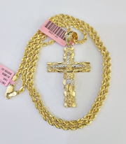 Real 14k Solid Rope Chain Jesus Nugget Cross Charm Set 3mm 18"-26" Necklace Gold