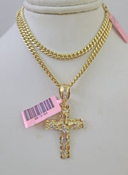 Real 14k Chain Cross Charm Set Miami Cuban Link 4mm Necklace Pendant Yellow Gold - With 18 Inch Chain