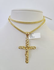 10K Franco Chain Jesus Cross Pendant Charm Necklace 20"-26" 3mm Gold Yellow SET - 20" chain with charm