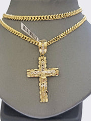Real 14k Gold Nugget Cross pendant Cuban Link Chain 4.5mm 24" Necklace Charm Set