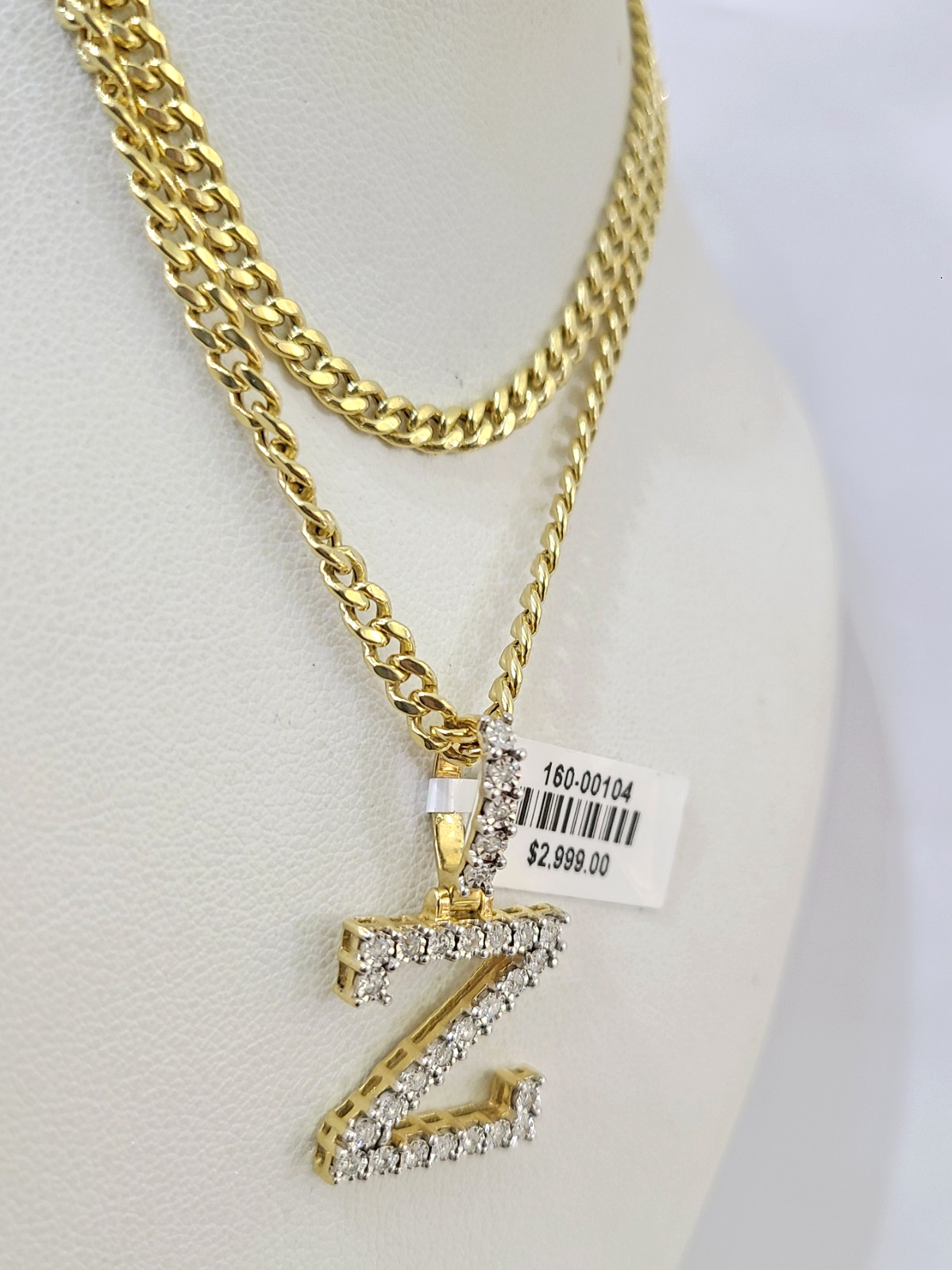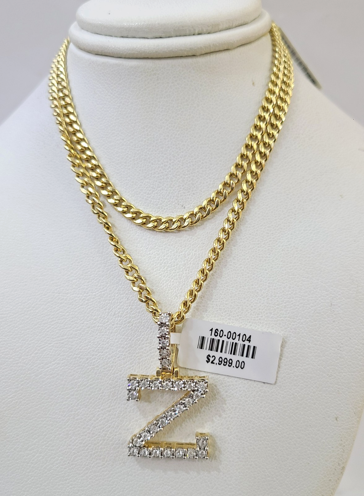 10K Gold Miami Cuban Chain Z Diamond Initial 20"-28" 3mm Pendant Necklace SET