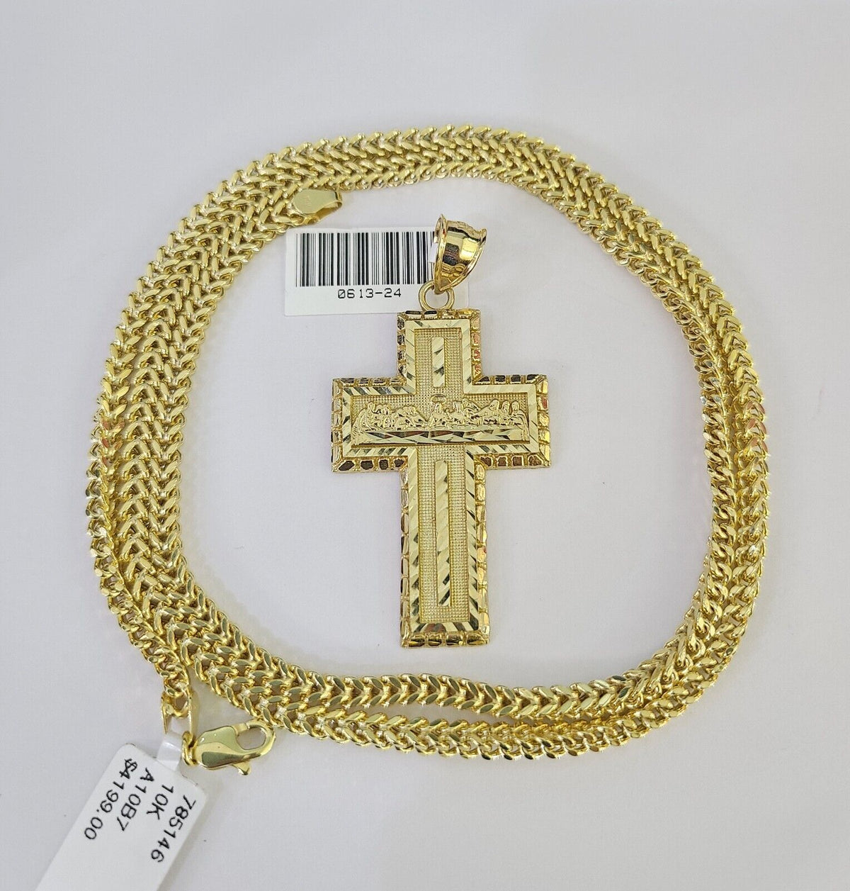 10K Franco Chain Last Supper Cross Pendant Charm Necklace 20"-26" 3mm Gold SET