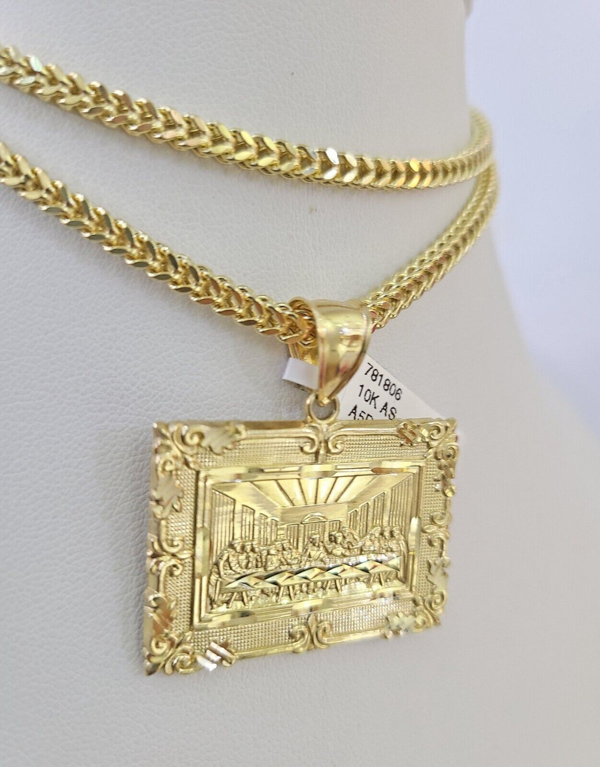 10K Franco Chain Last Supper Pendant Charm Necklace 20"-26" 3mm Yellow Gold SET