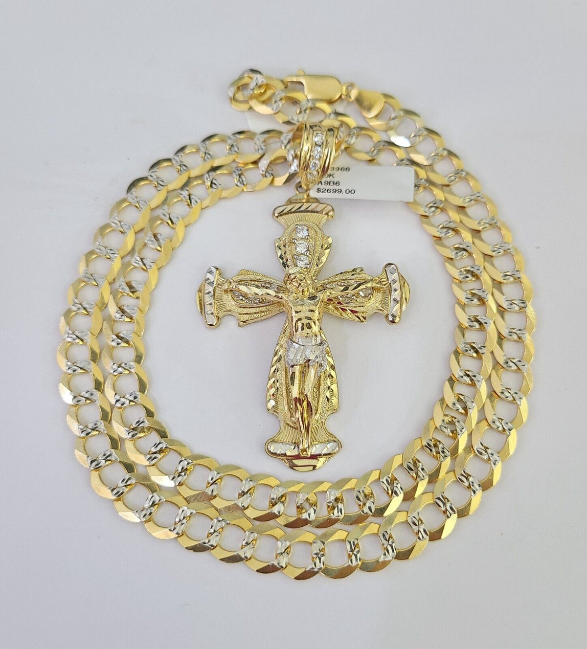 10k Gold Chain Cross Charm Solid Cuban Curb Necklace 9mm 20"-30" Diamond Cut SET - 20" Chain with Charm