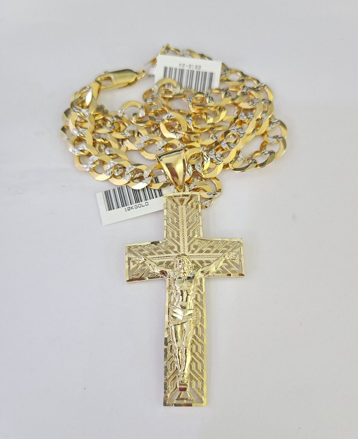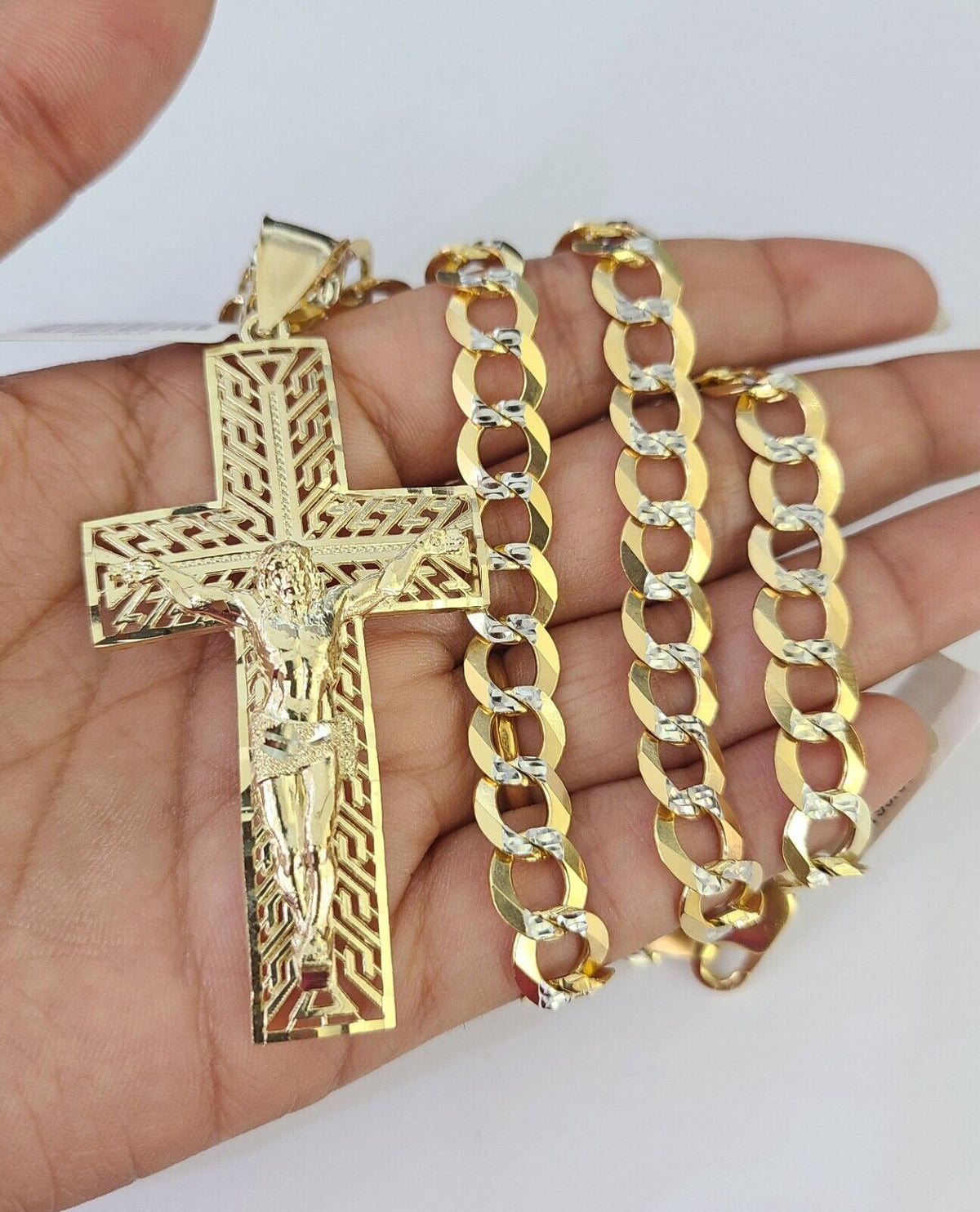 10k Gold Chain Cross Charm Solid Cuban Curb Necklace 9mm 20"-30" Diamond Cut SET