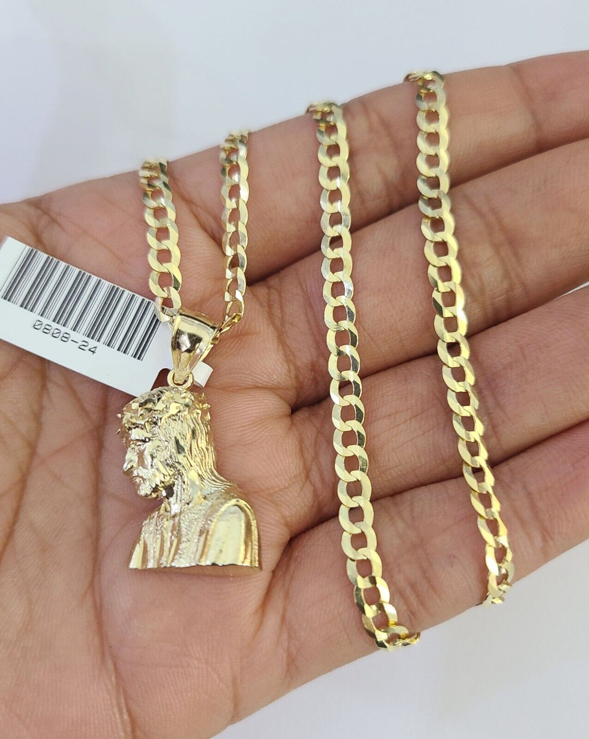 10k Gold Cuban Curb Chain Jesus Head Charm Solid 4mm 18"-28" SET Neckl – Goldenlinq index