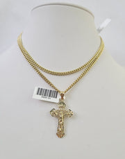 10K Gold Miami Cuban Chain Jesus Cross Charm 18"-30" 3mm REAL Pendant - 18" Chain with Charm