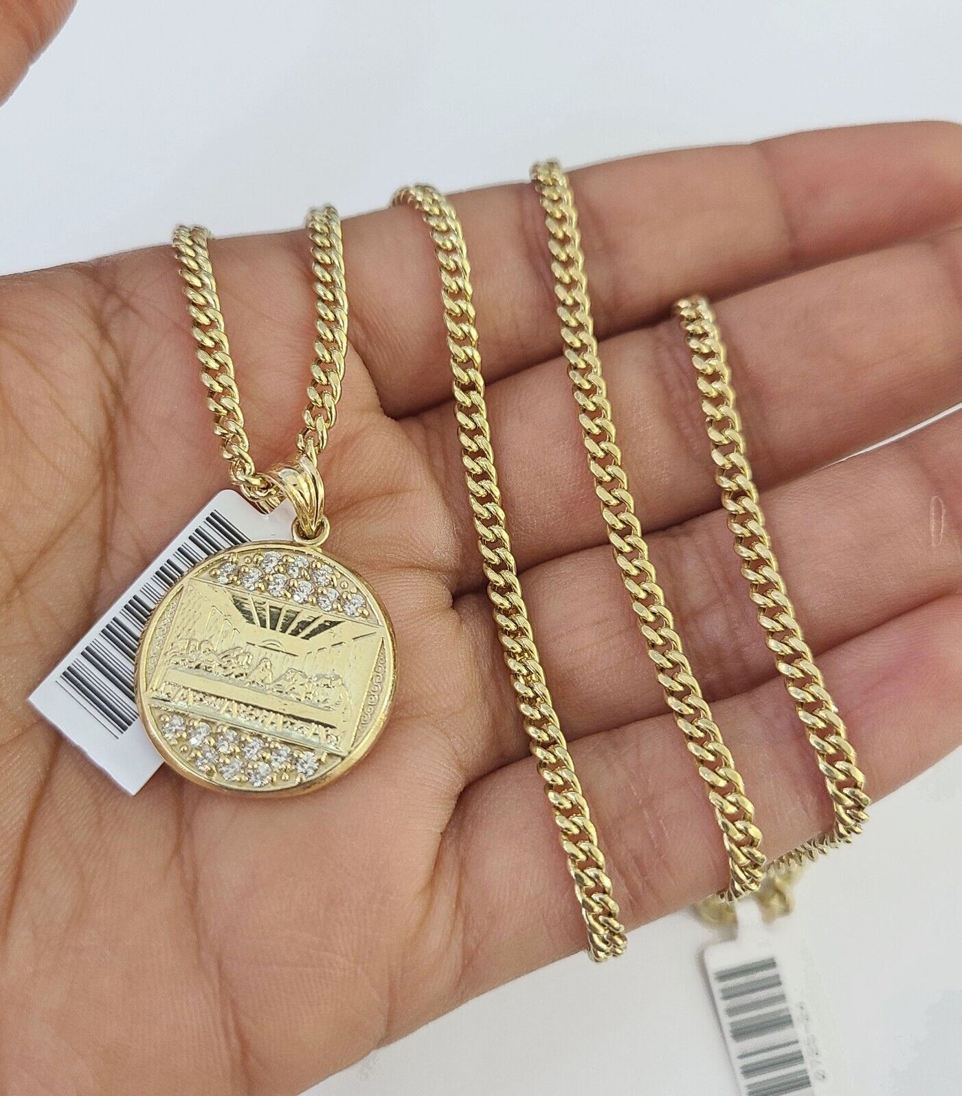 10K Gold Miami Cuban Chain Last Supper Charm 18"-30" 3mm REAL Pendant Necklace - 18" Chain with Charm
