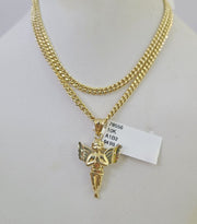 10K Gold Miami Cuban Chain Praying Angel 18"-28" 3mm REAL Pendant Necklace SET - 18" Chain with Charm