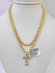 10k Gold Rope Chain T Diamond Alphabet Charm Necklace SET 3mm 18"-28" Pendant