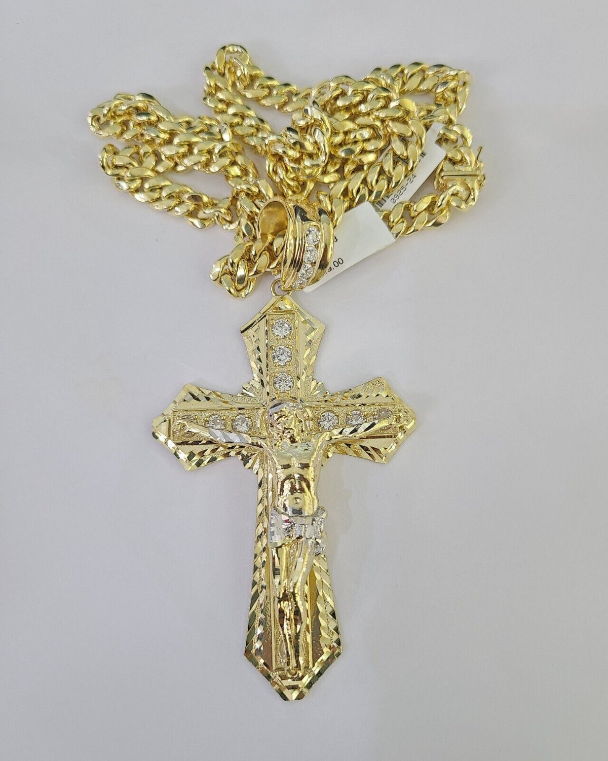 10K Miami Cuban Link Chain Jesus Cross Pendent Charm 8mm 20"-30" Necklace Gold - 20" with Charm