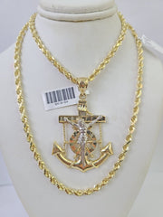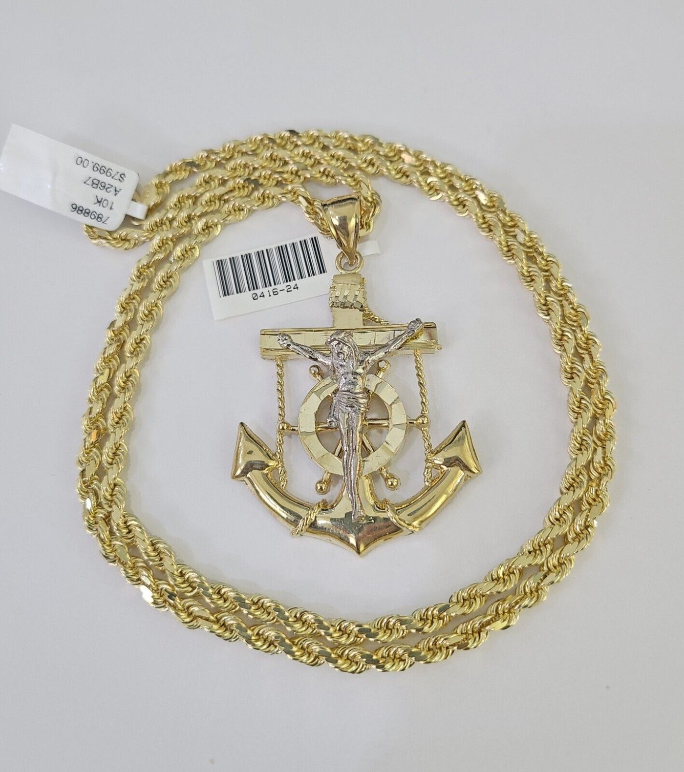 10k Solid Rope Chain Jesus Anchor Charm Set 4mm 20"-28" Necklace Gold Yellow - 20" Chain with Charm