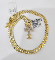 10k Solid Yellow Gold Cuban Curb Chain T Diamond Pendant Charm 3mm Necklace Set - 22 Inches