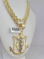 Real 10k Solid Rope Chain Jesus Anchor Charm Set 6mm 20"-30" Necklace Gold - 20" Chain with Charm
