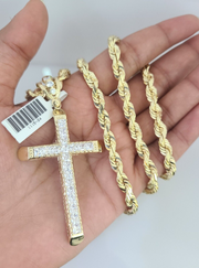 Real 10k Solid Rope Chain Jesus Cross Charm Set 6mm 20"-30" Inch Necklace Gold - 20" Chain with Charm