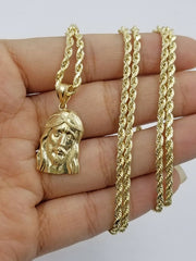 REAL 10k Rope Chain And Jesus head face Charm Pendant 3mm Necklace Set 16"-28" - 18 Inch (Short Length)