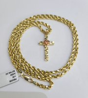 REAL 10k Jesus Rose Cross Charm Rope Chain Pendant 3mm Necklace Set 18"-28" in - 18 Inch (Short Length)
