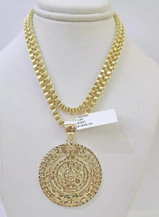 REAL 10k Gold Byzantine Chain Necklace Mayan Calendar charm Pendant 10kt Men's SET - 20 inch (Short Length)