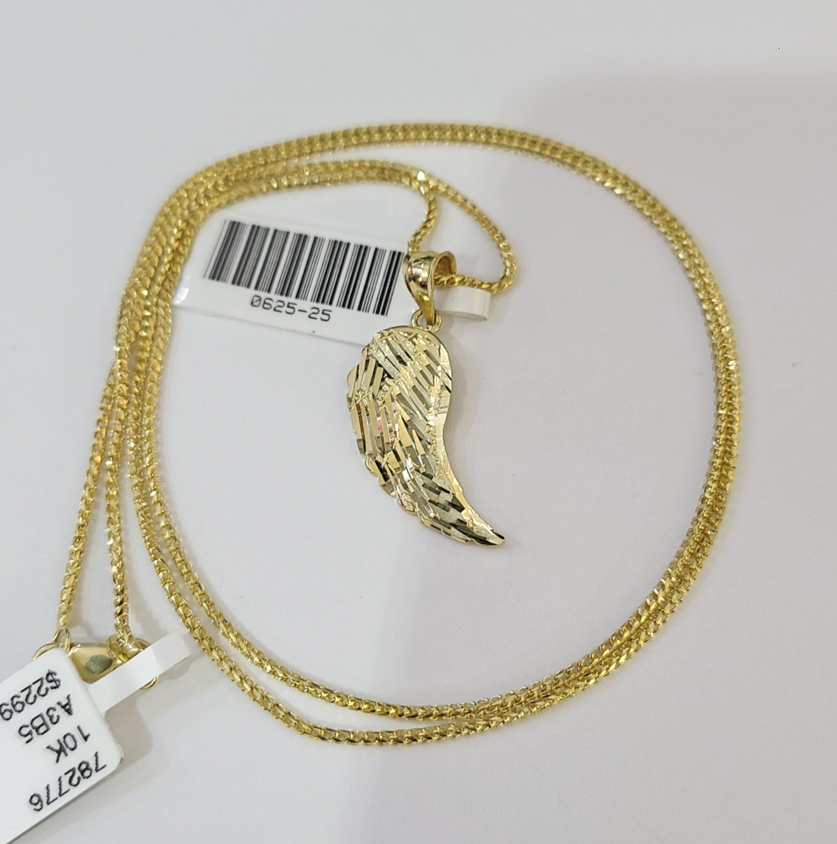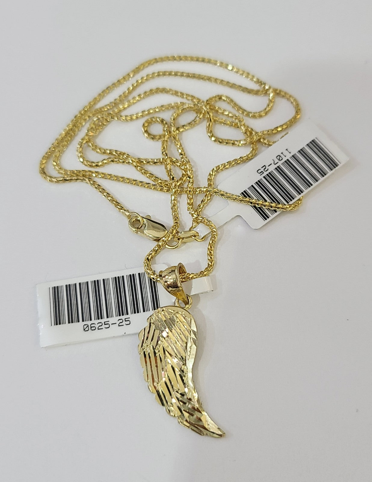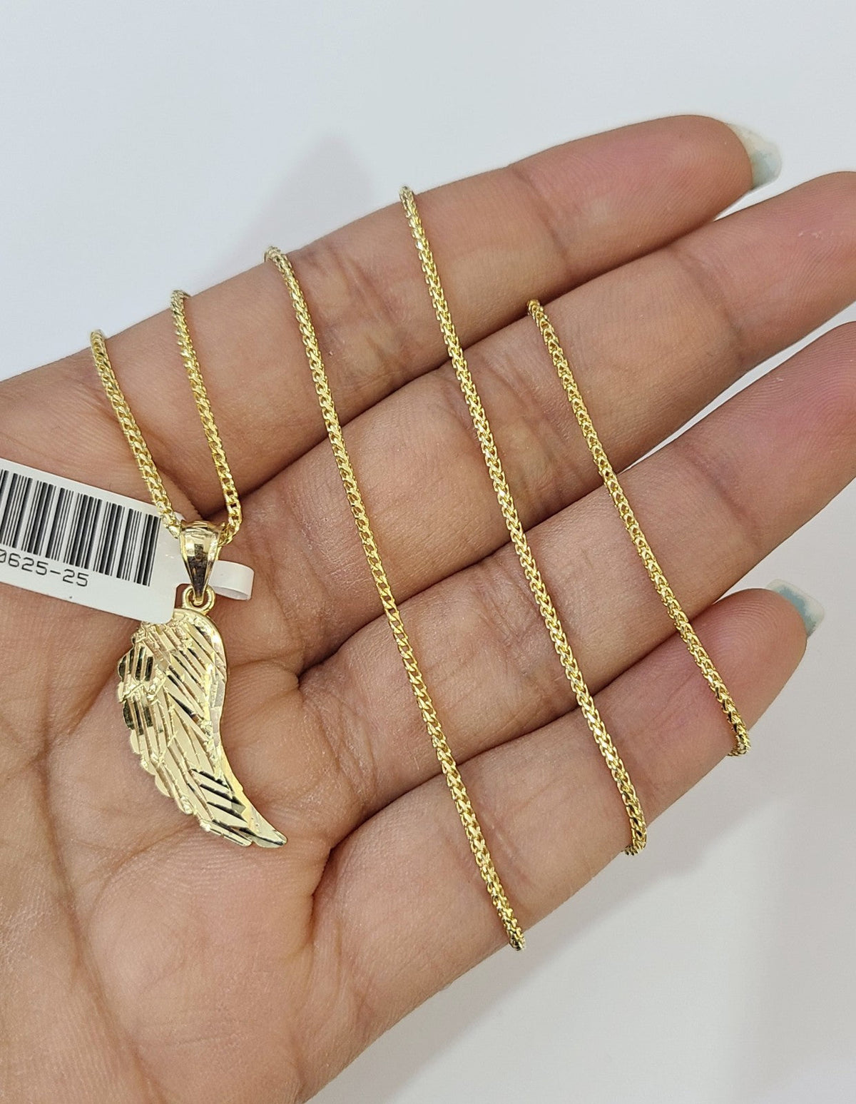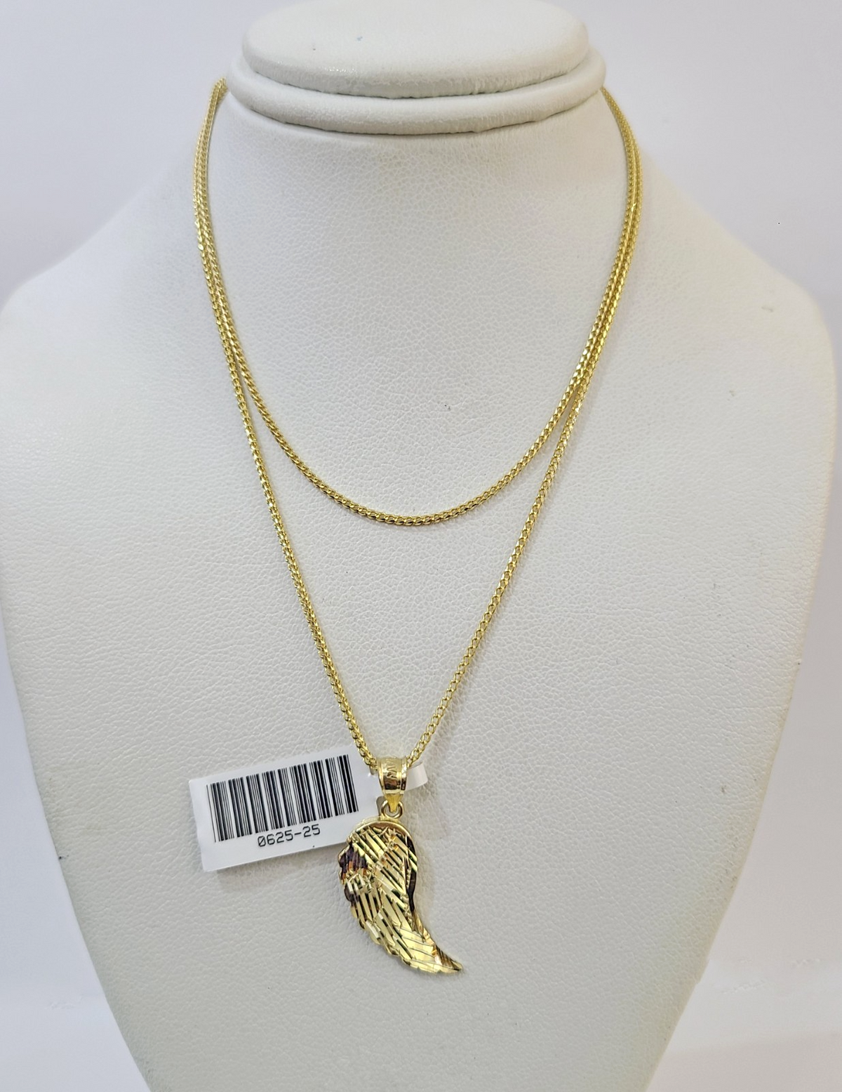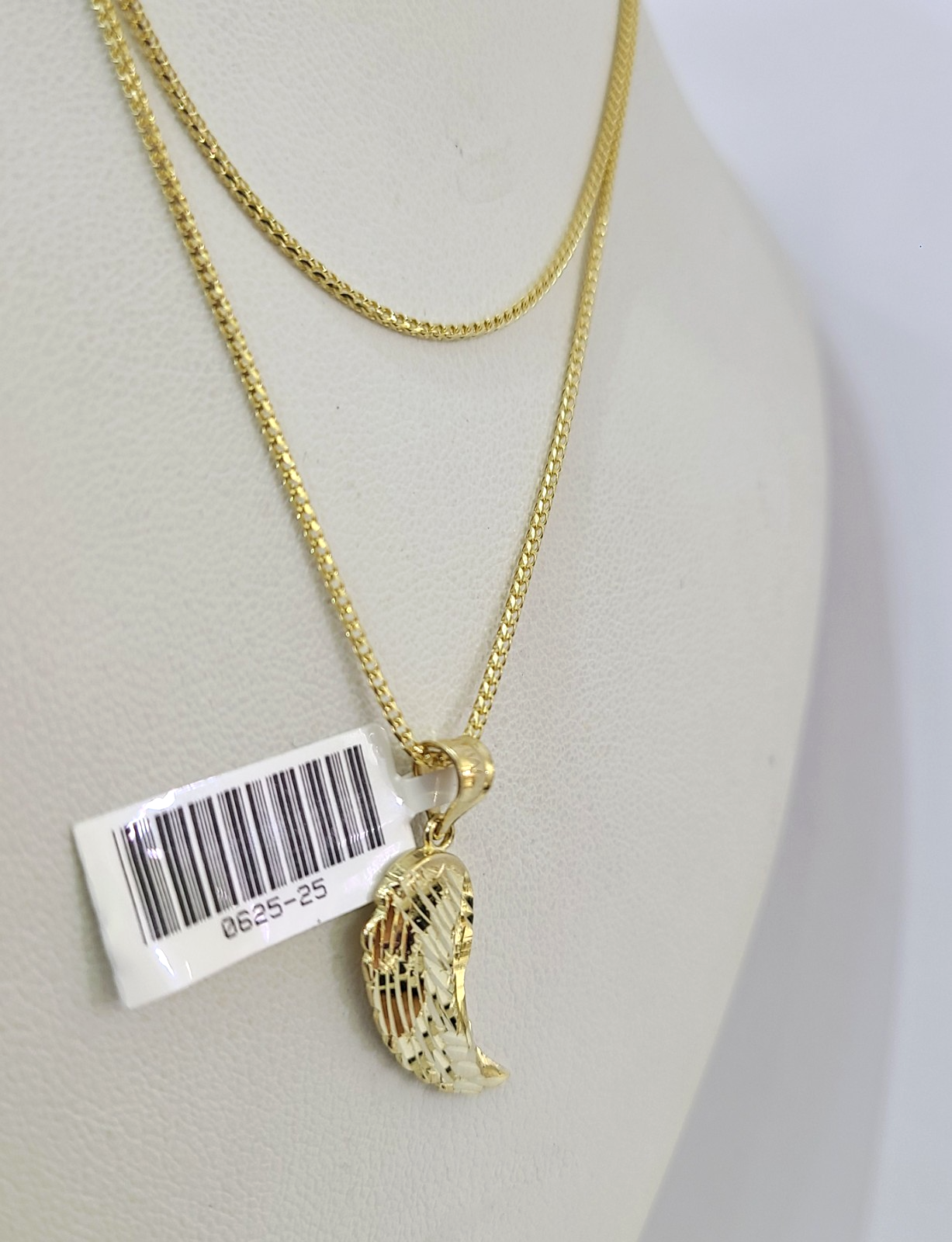 10kt Yellow Gold Franco Chain Necklace Angel Wing Charm Pendant 1mm 16-22 inches
