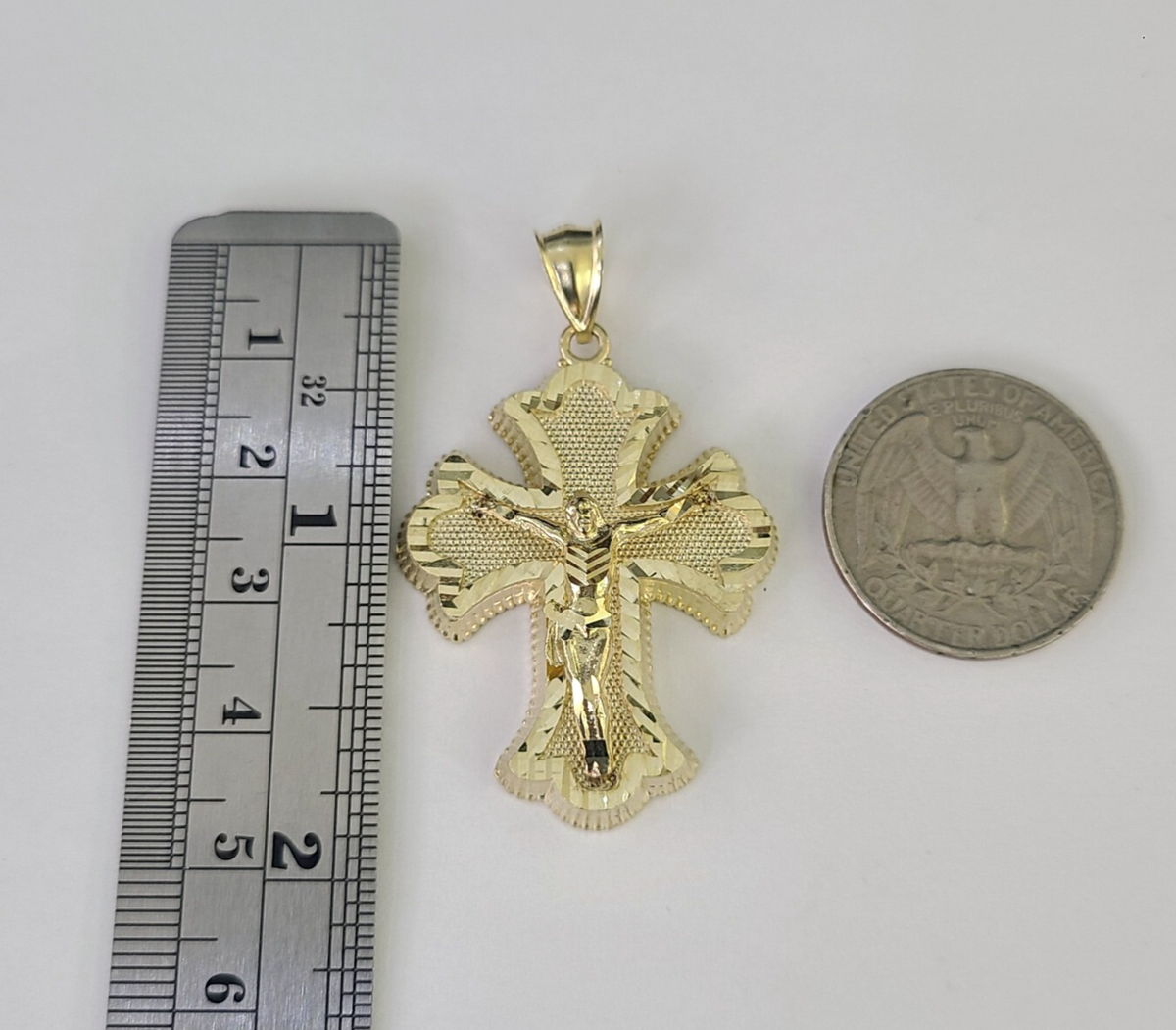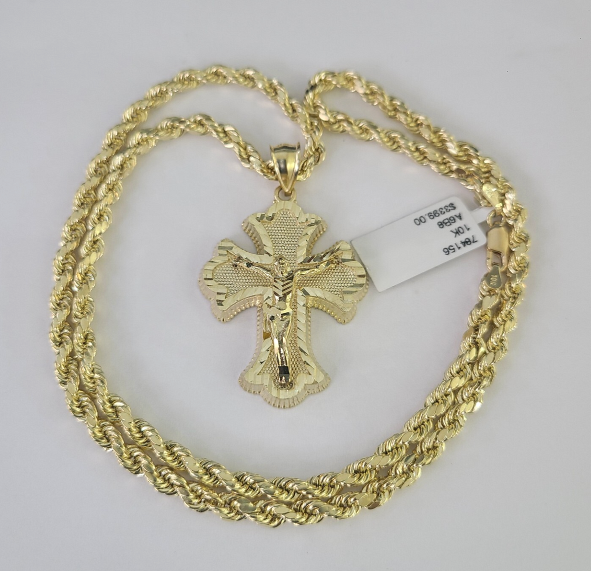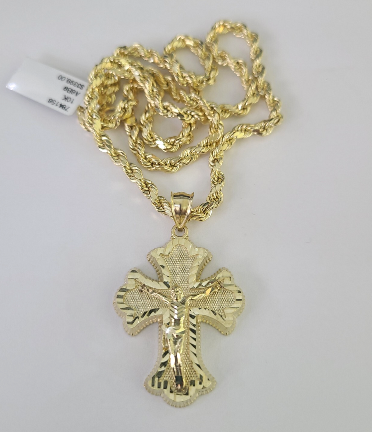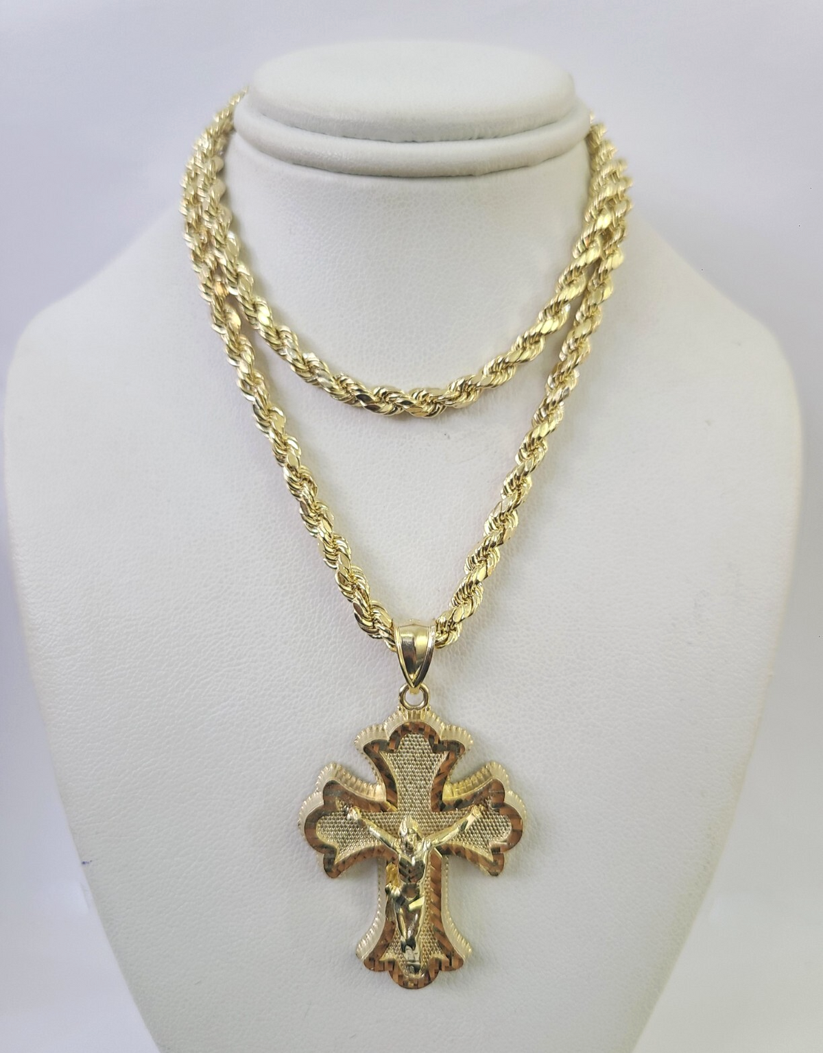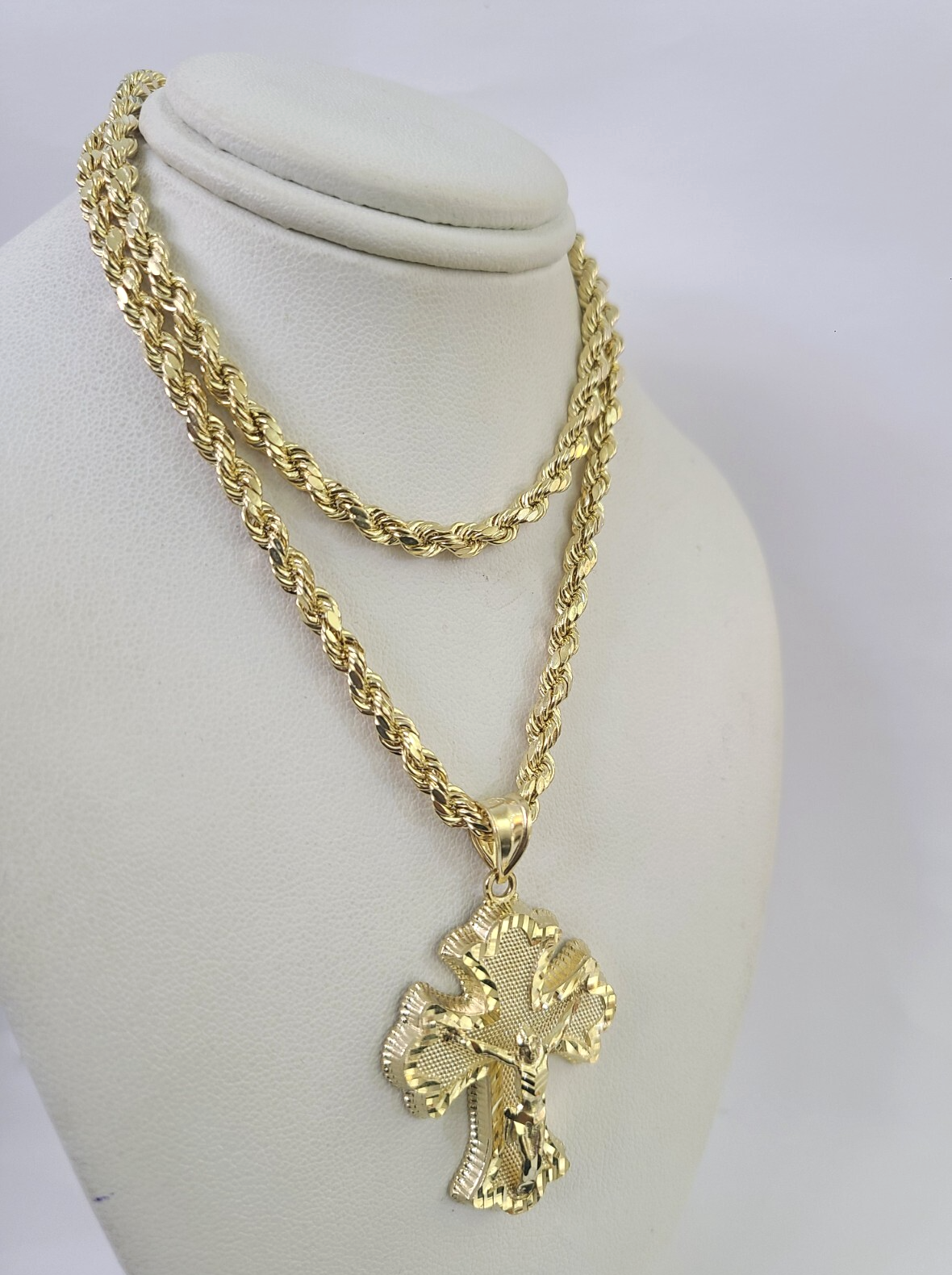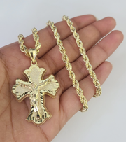 REAL 10k Jesus Crucifix Cross Charm Rope Chain Pendant 4mm Necklace Set 18"-28" - 18 Inch (Short Length)