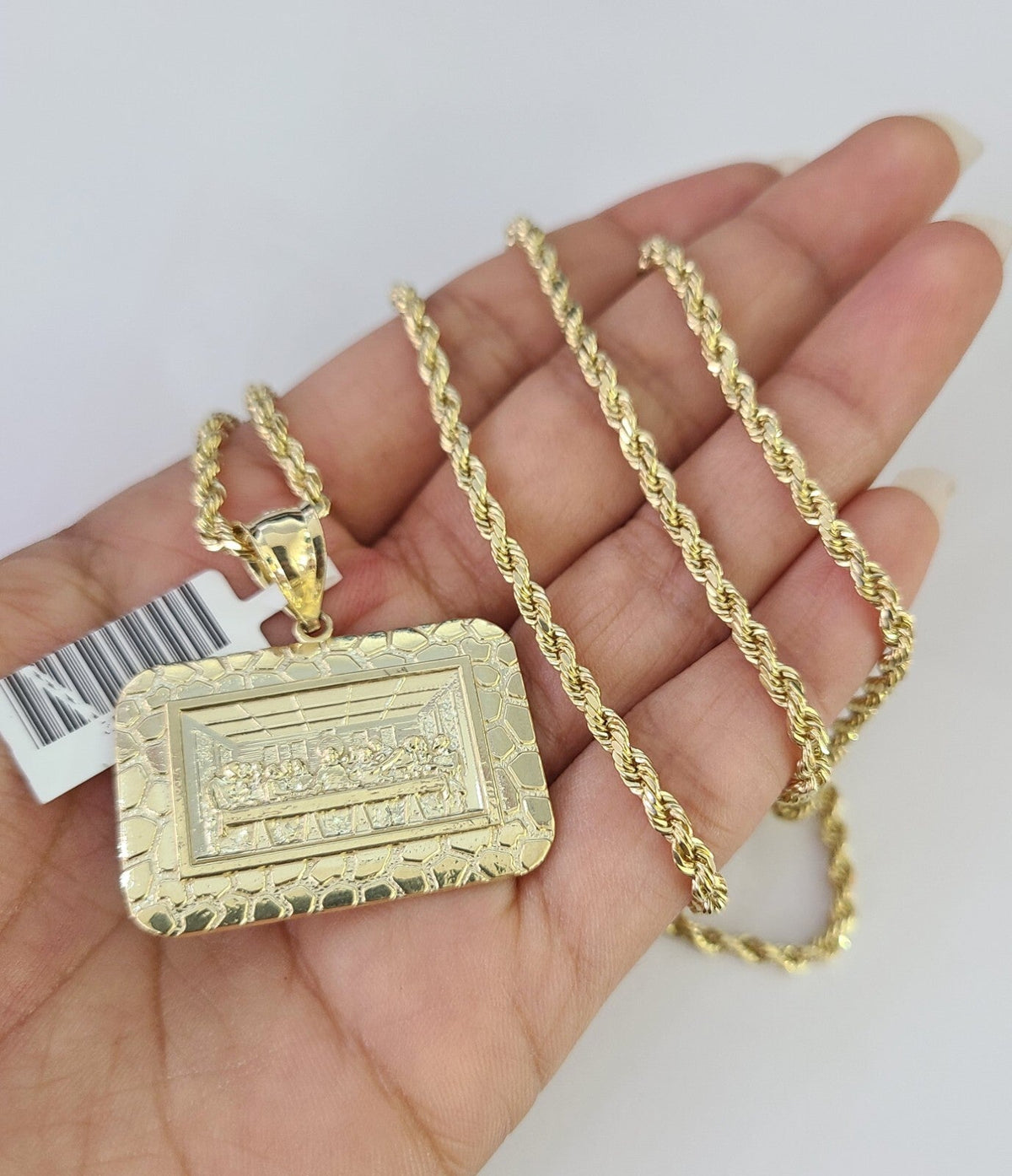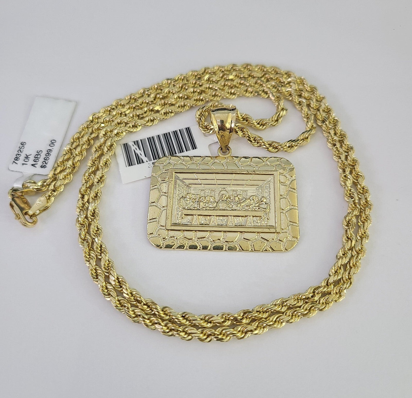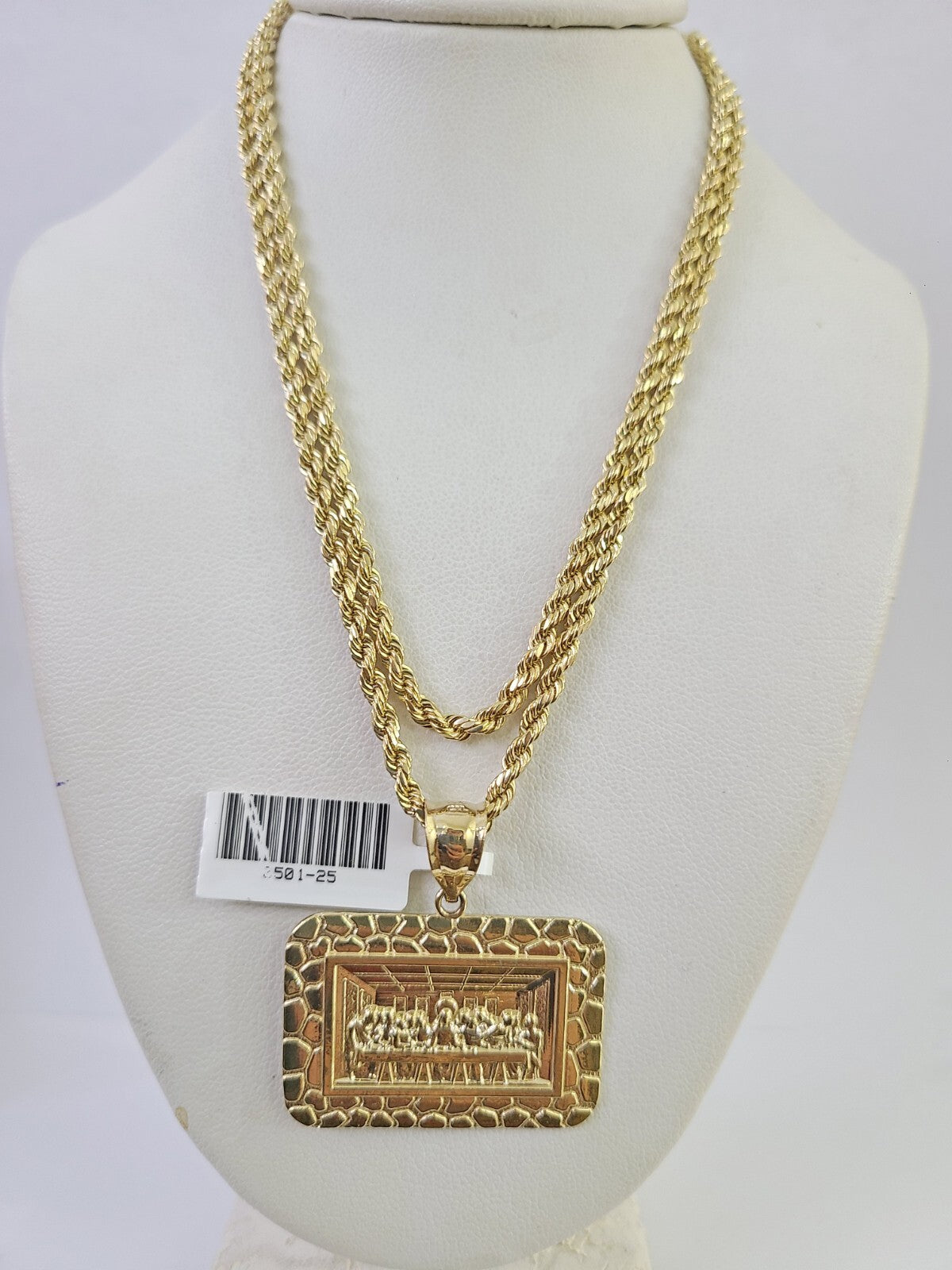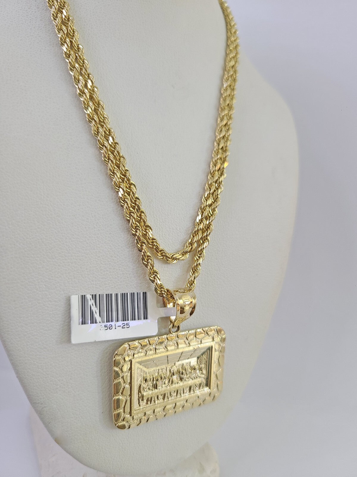 REAL 10k Rope Chain 3mm Last Supper Charm Pendant Necklace Set 18"-30" in - 18 Inch (Short Length)