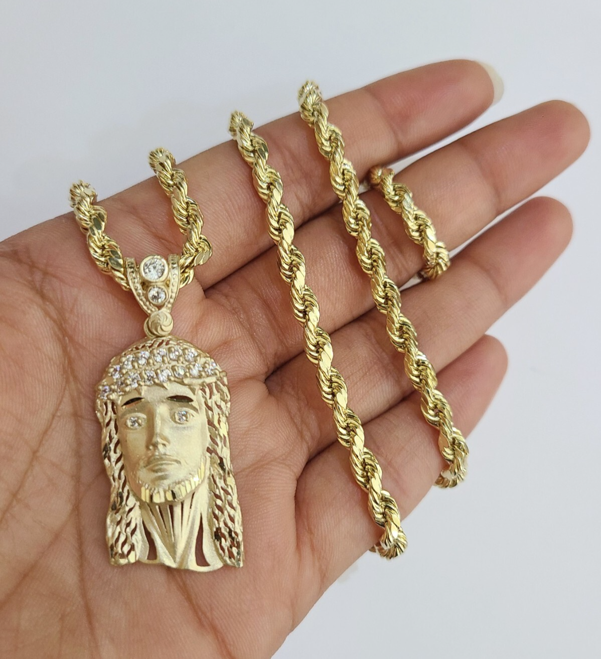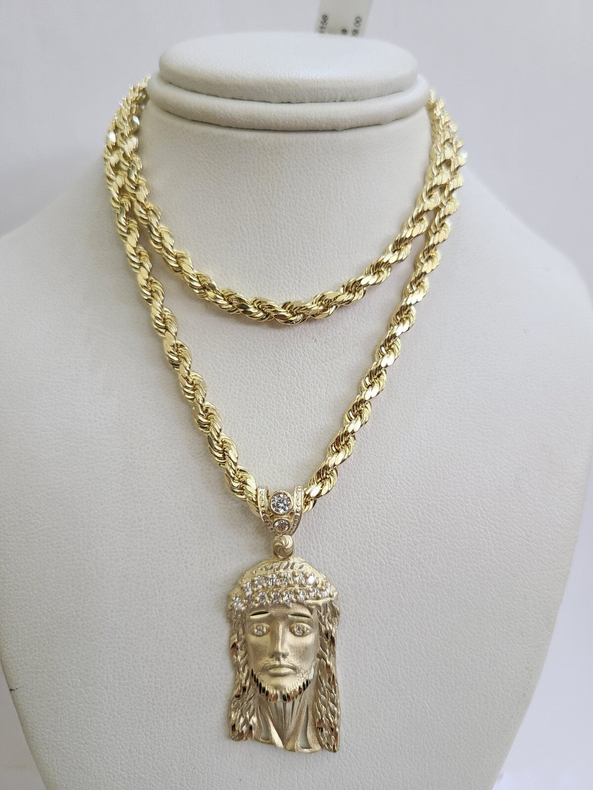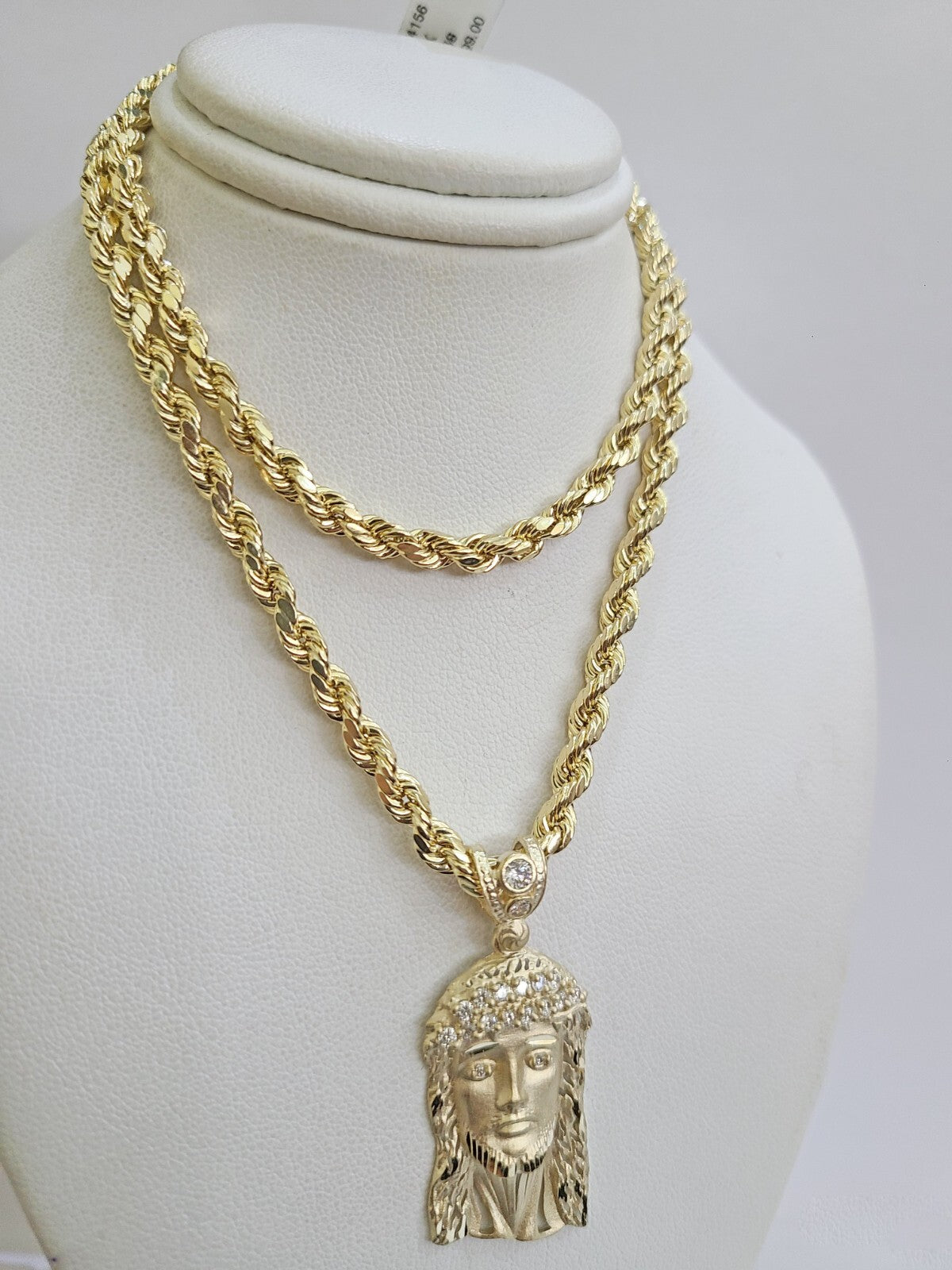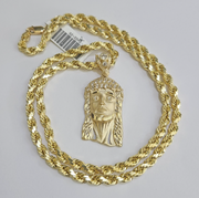 REAL 10k Rope Chain Jesus Head Charm Pendant 4mm Necklace Set 18"-28" in - 18 Inch (Short Length)