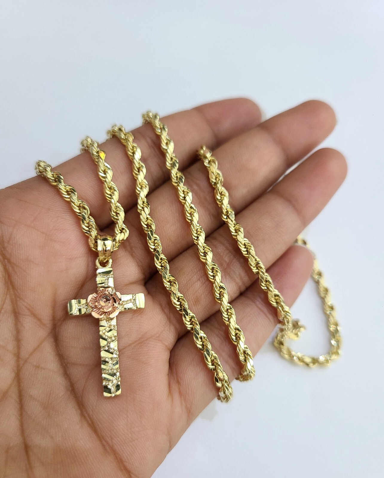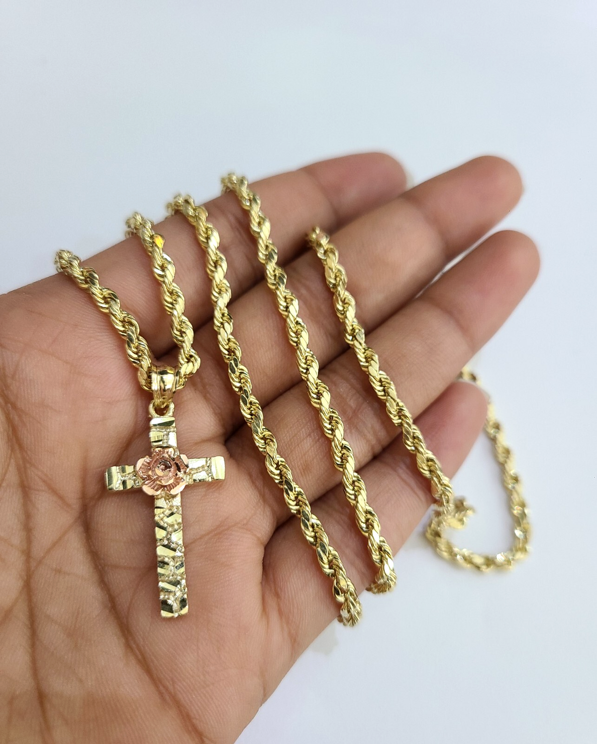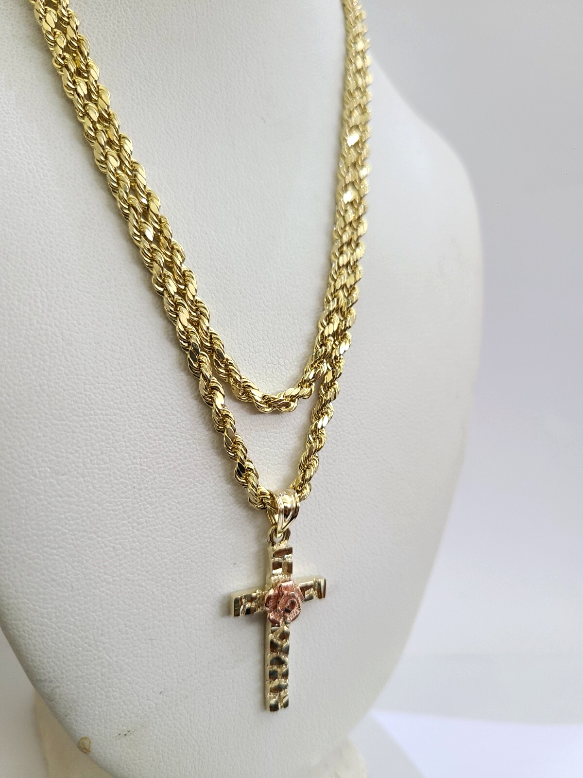 REAL 10k Rope Chain Jesus Rose Cross Charm Pendant 3mm Necklace Set 18"-28" in - 18 Inch (Short Length)