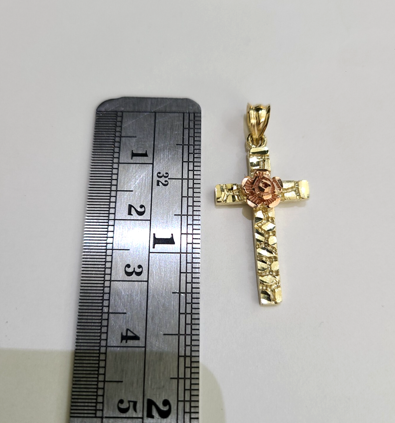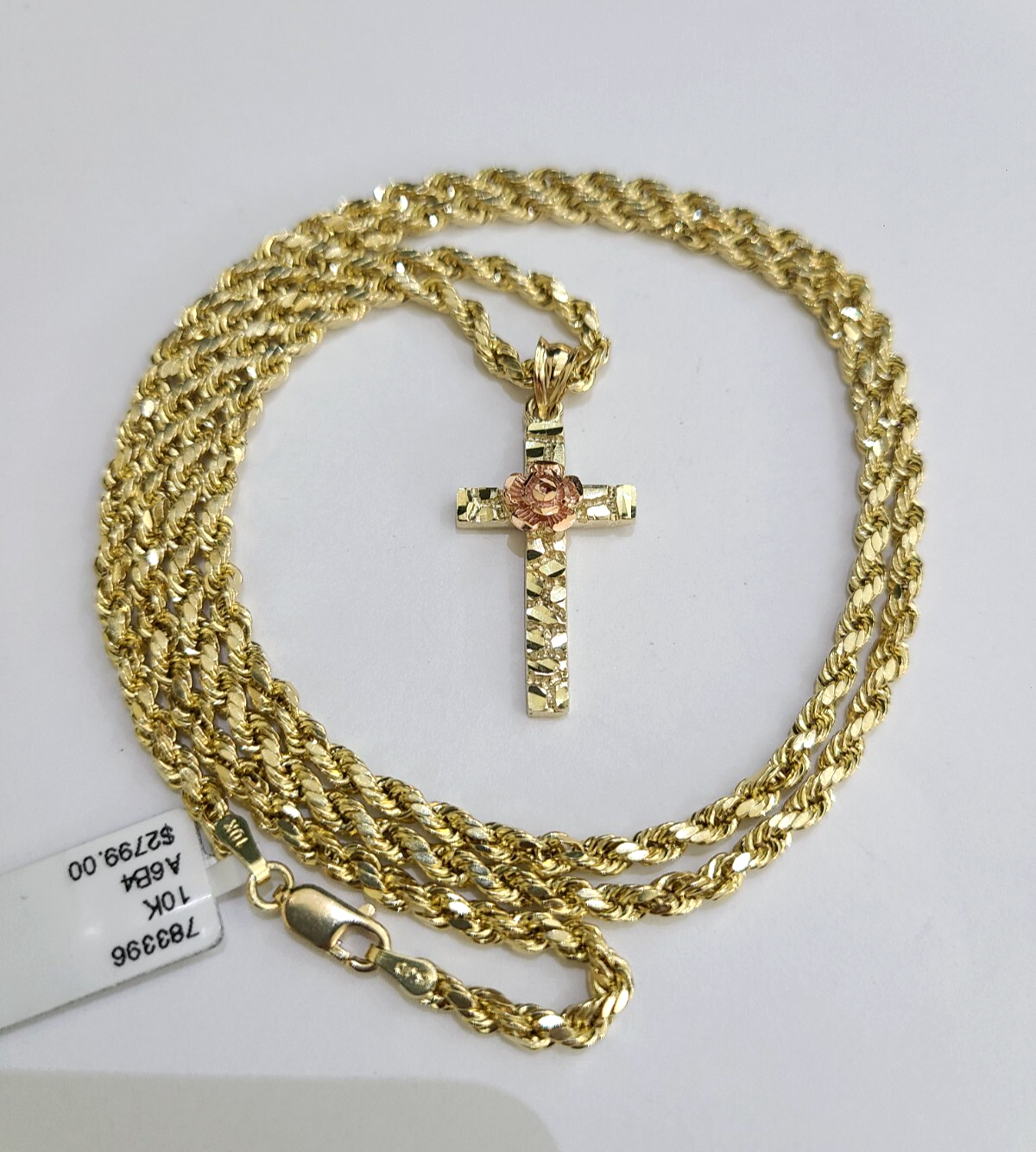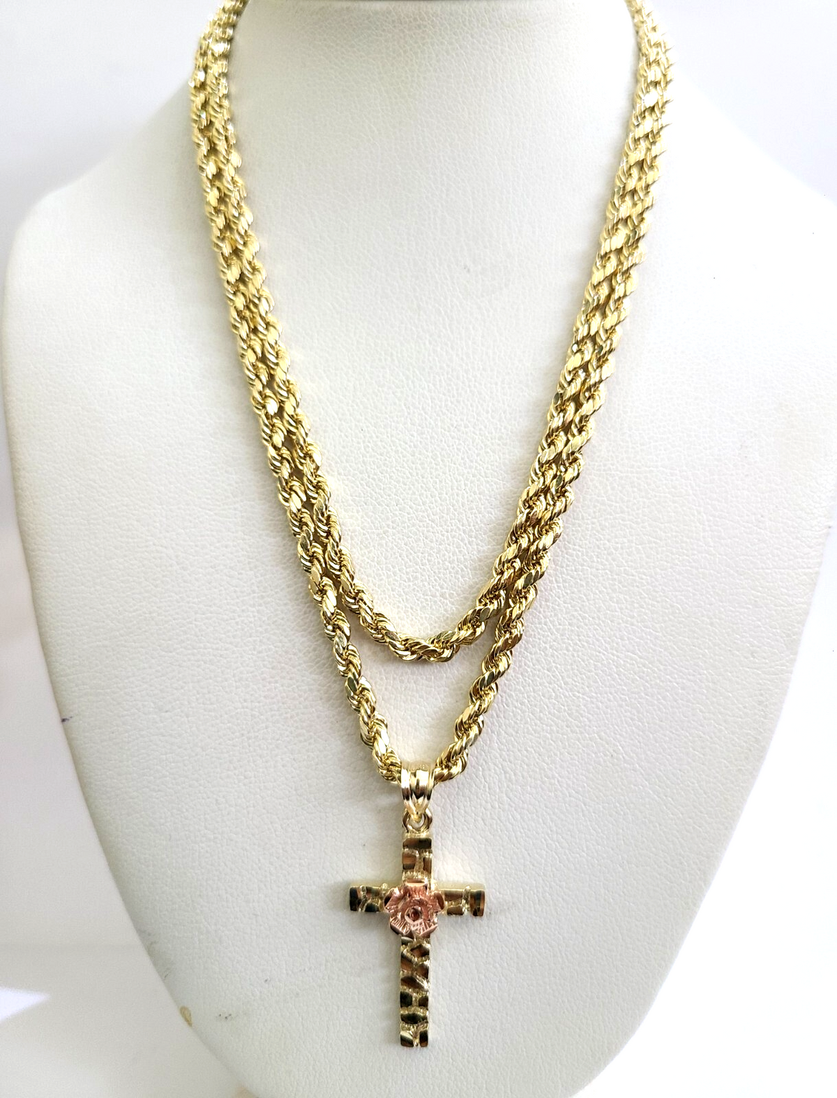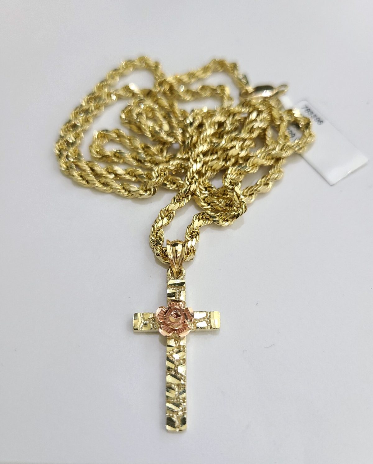 REAL 10k Rope Chain Jesus Rose Cross Charm Pendant 3mm Necklace Set 18"-28" in - 18 Inch (Short Length)