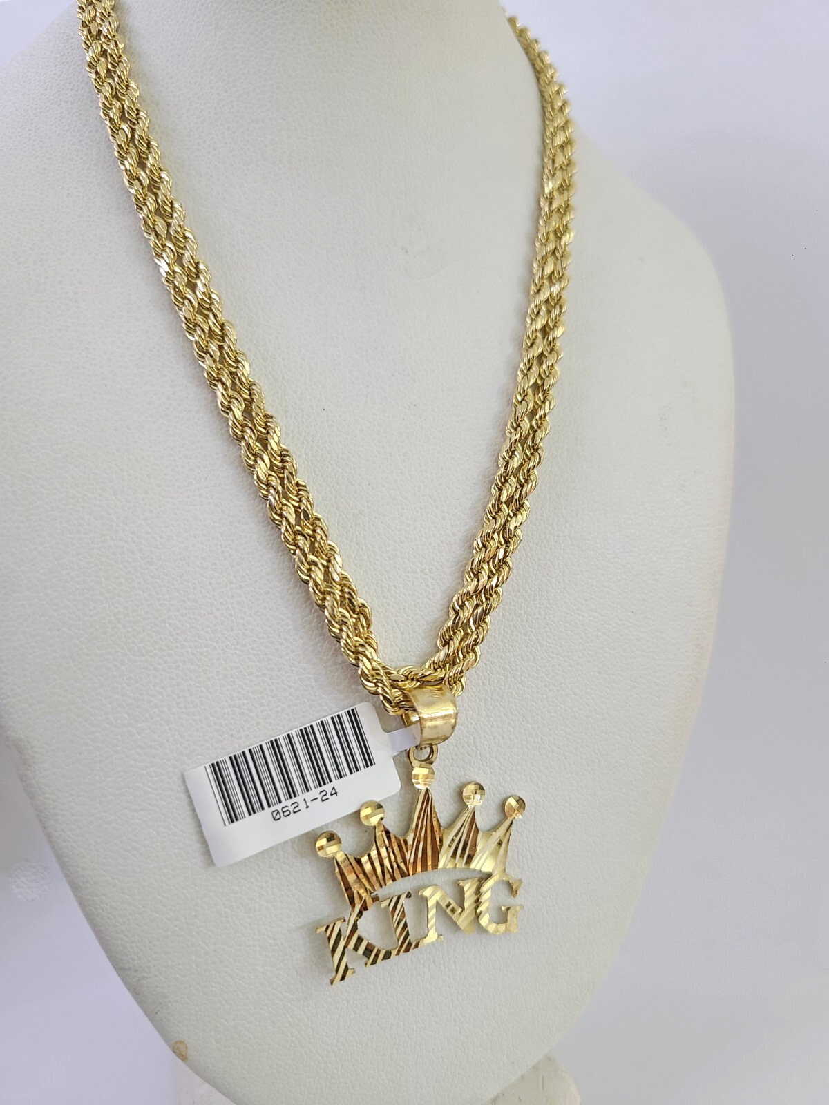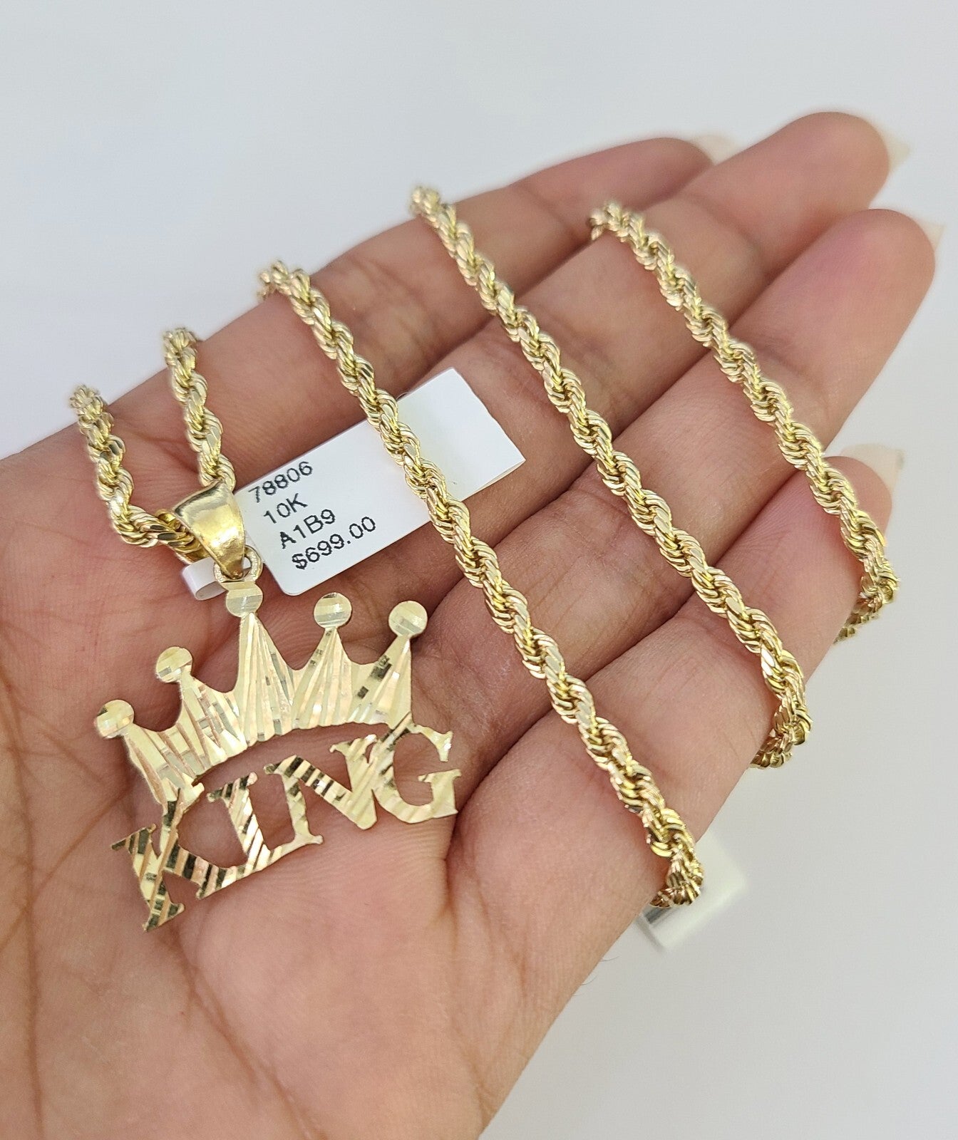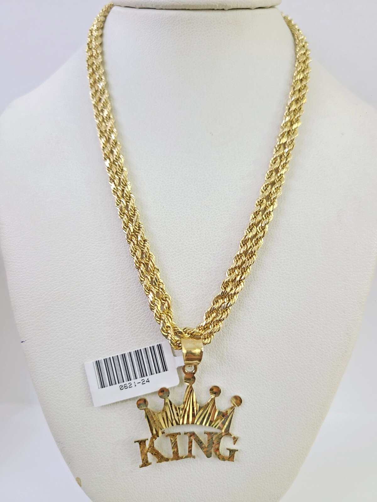 REAL 10k Rope Chain King Crown Charm Pendant 3mm Necklace Set 18"-30" in - 18 Inch (Short Length)