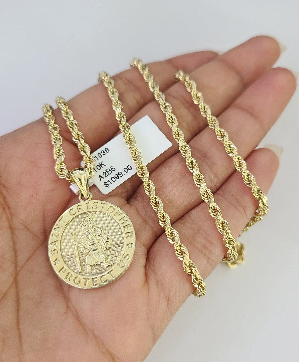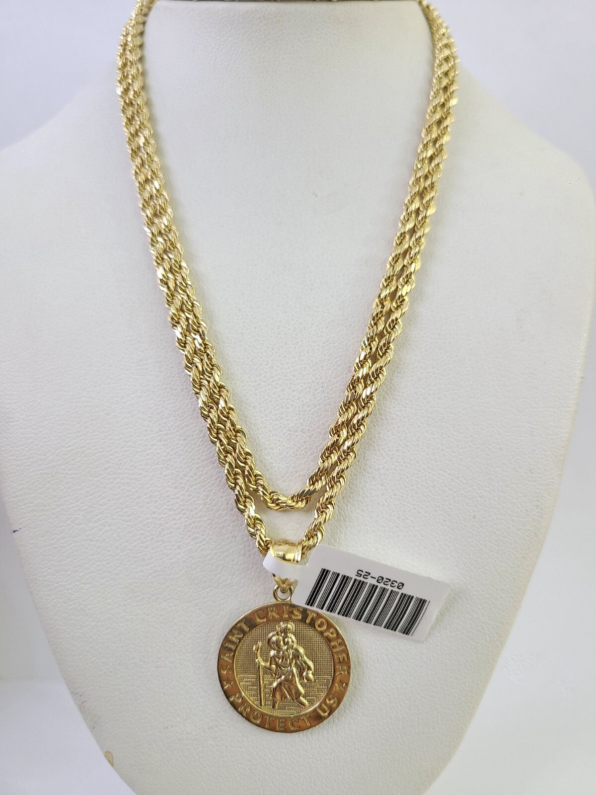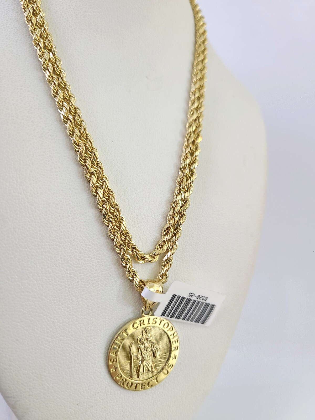 REAL 10k Rope Chain Saint Christopher Charm Pendant 3mm Necklace Set 18"-30" in - 18 Inch (Short Length)