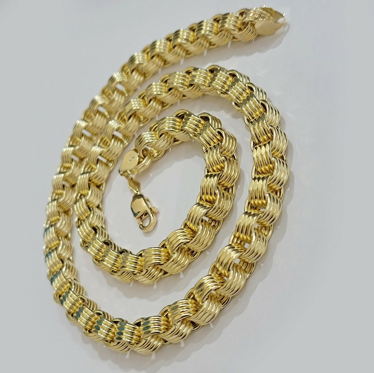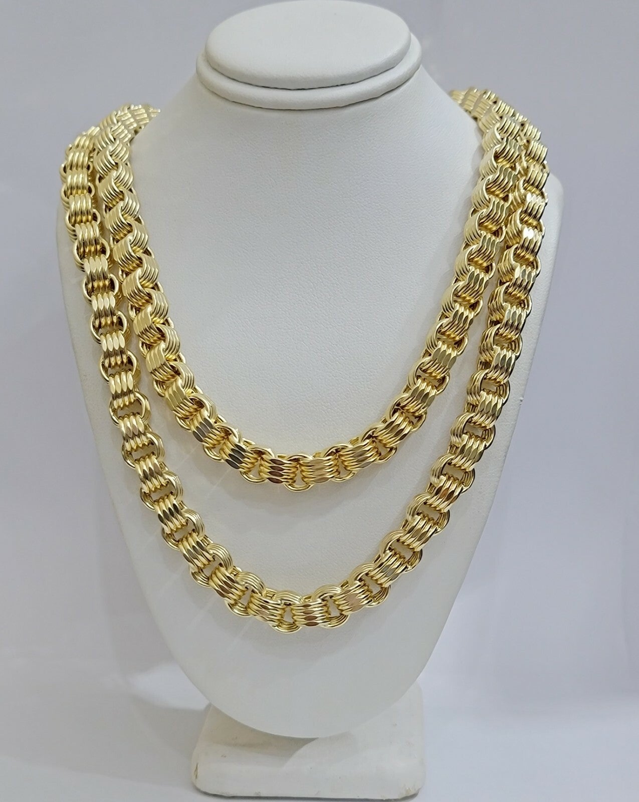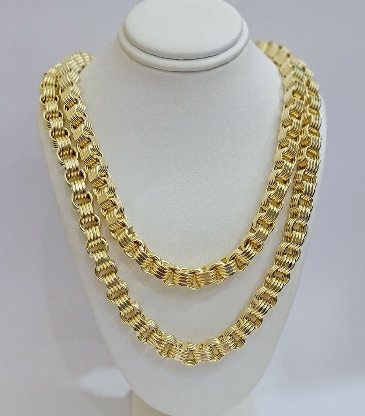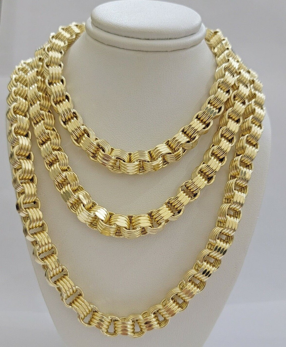 10 KT Yellow Gold ( Real , Not plated , Not filled ) Byzantine Thick Necklace chain. The Width of the necklace is 8mm-8.5mm and in Various Length stating From 22 Inches and 24 Inches, 26 Inches, 28 Inches, 30 Inches The Clasp is Lobster Lock. The chain is considered durable.